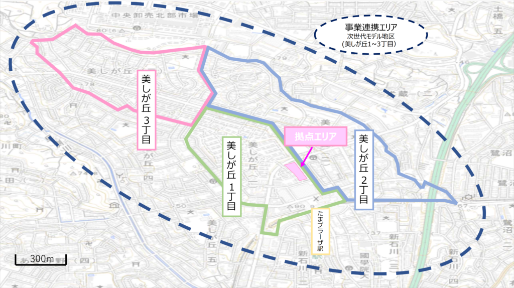ドレッセWISEたまプラーザを拠点エリアとし、このエリアマネジメント活動を通じて地域課題等の解決に貢献する事業連携エリアはおおむね次世代郊外まちづくりのモデル地区(美しが丘1~3丁目)としています。